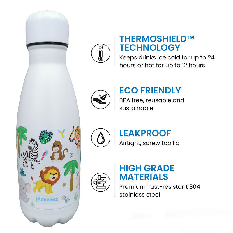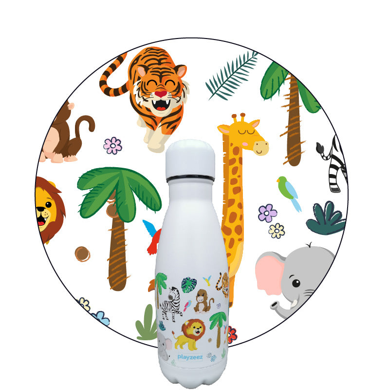 This bespoke Kids Safari Water Bottle' is eco-friendly and sustainable, something we value here at Playzeez. We wanted to bring a collection of kids water bottles into our range that stood out with fun bright designs as well as being practical for everyday use. Our kids safari water bottle makes it an adorable addition that teams well with our range of Animal Character Backpacks