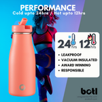 The new Evolution bottle. Bright Coral coloured, stainless steel vacuum insulated isothermal water bottle. Luxe bottles designed to keep your beverage cool for 24hrs or hot for 12hrs. CAUTION: Do Not use boiling water. We recommend 80c max and advise to open with care when using hot water.