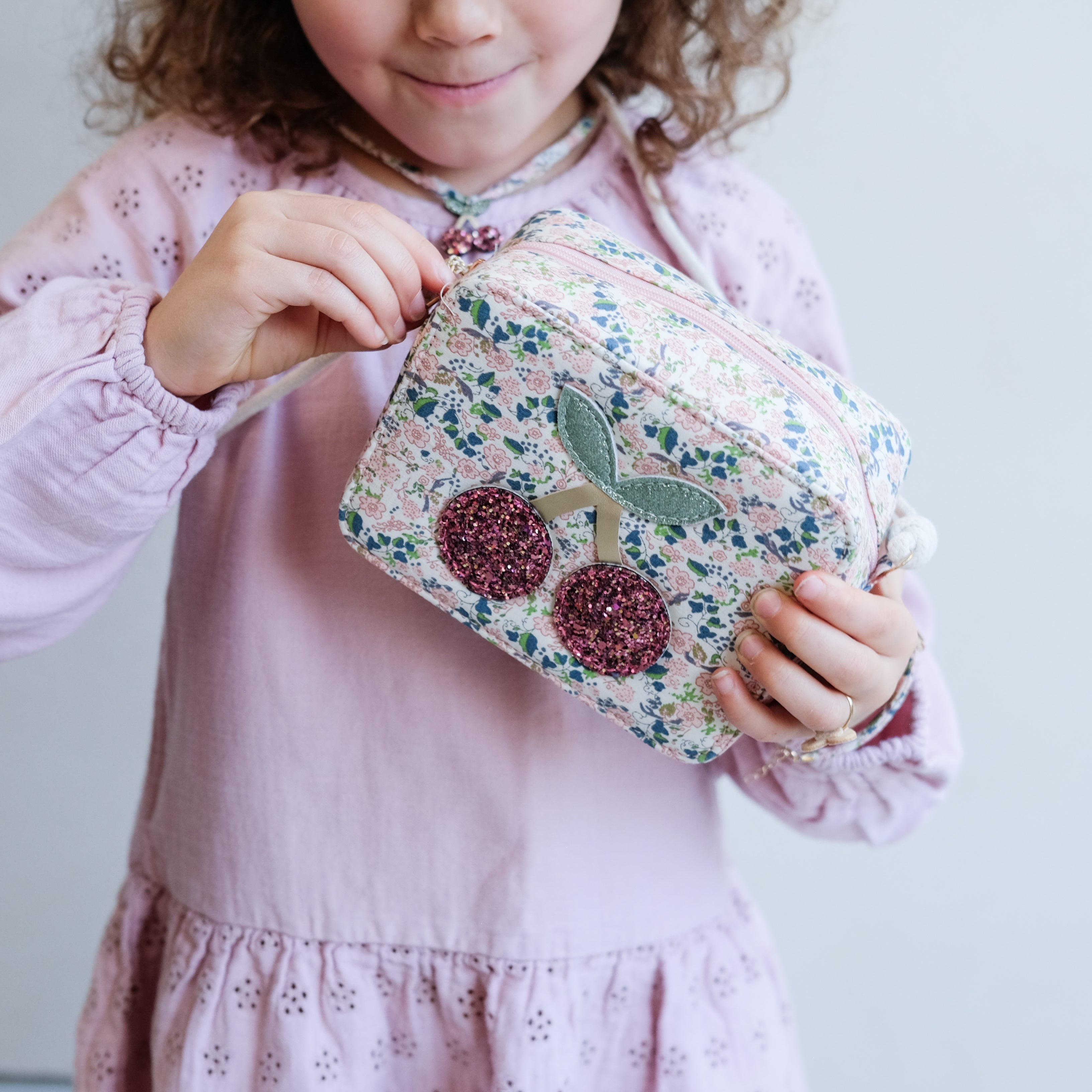 • Crafted from a ditsy print floral fabric with glitter cherries and zip top closure
