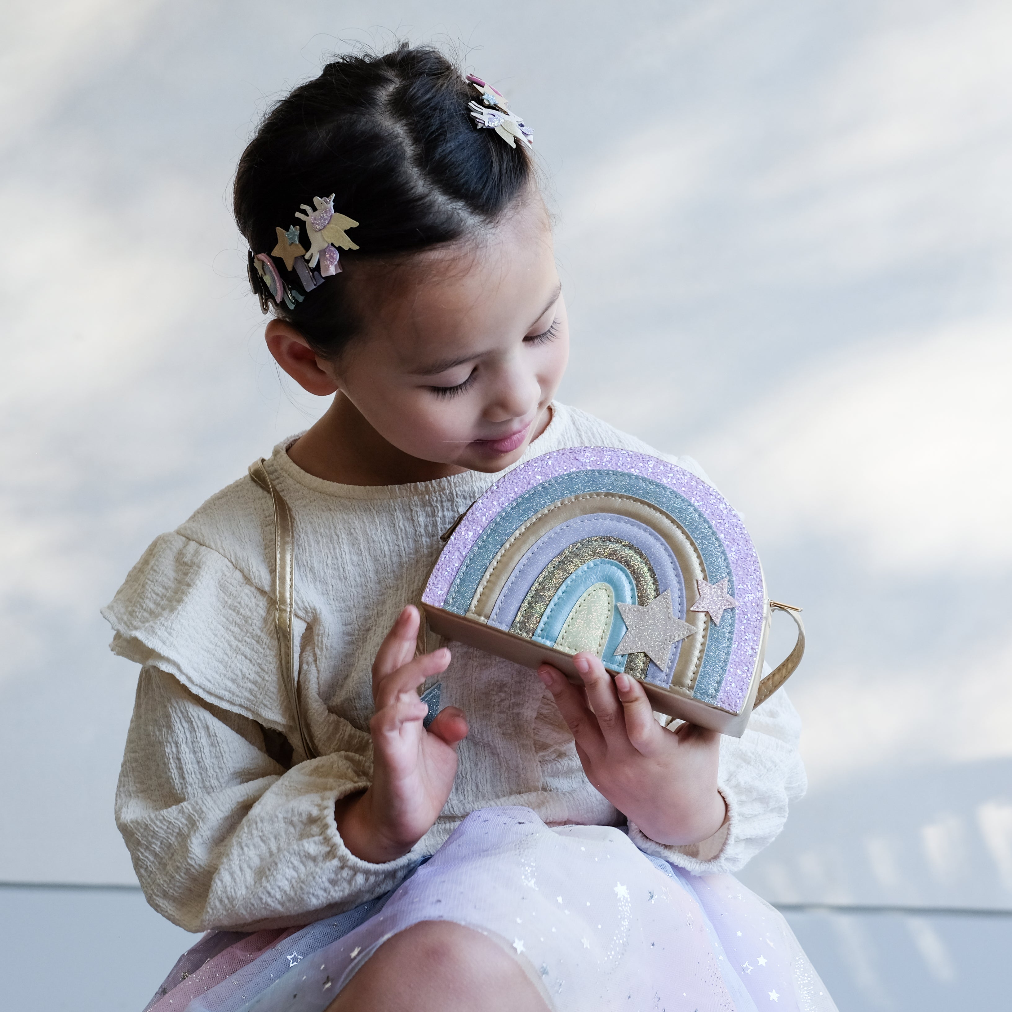 Our Dreamland rainbow bag is a perfect blend of glitter, sparkles, and pastel perfection! With plenty of room for their tiny treasures, this bag is guaranteed to bring a little magic to every outfit!