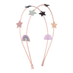 Add some sparkly style with this gorgeous bright and cheerful double alice band! This dazzling Rainbow and star double alice band is perfect for a party or everyday. This super sweet alice will have them shining from dawn till dusks!