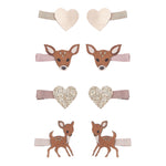 Meet our new friend, Felicity fawn! An adorable pack of mini clips featuring two cute little deers in the beautiful shades of tawny brown, gold and soft pink paired with heart shape gold mini clips. These are sure to add some playful twist to any hair style for your little ones!