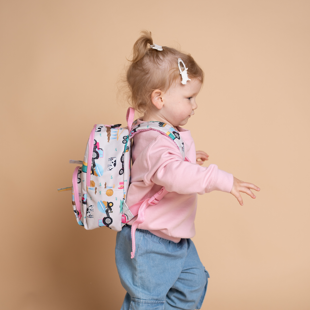 Get your little one ready for adventures with our beautiful Mini Tractor Baby and Toddler Backpack with Pink Trims! Perfect for girls aged 9 months to 3 years, this adorable and girly toddler is as charming as it is functional. Featuring a pale grey base with vibrant pink trims, it’s adorned with colourful tractors, balers, cows, and more, adding a playful touch.