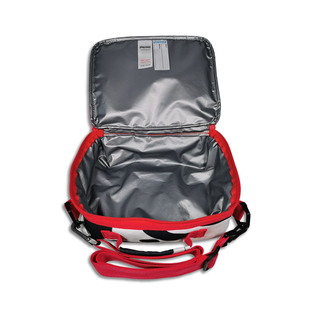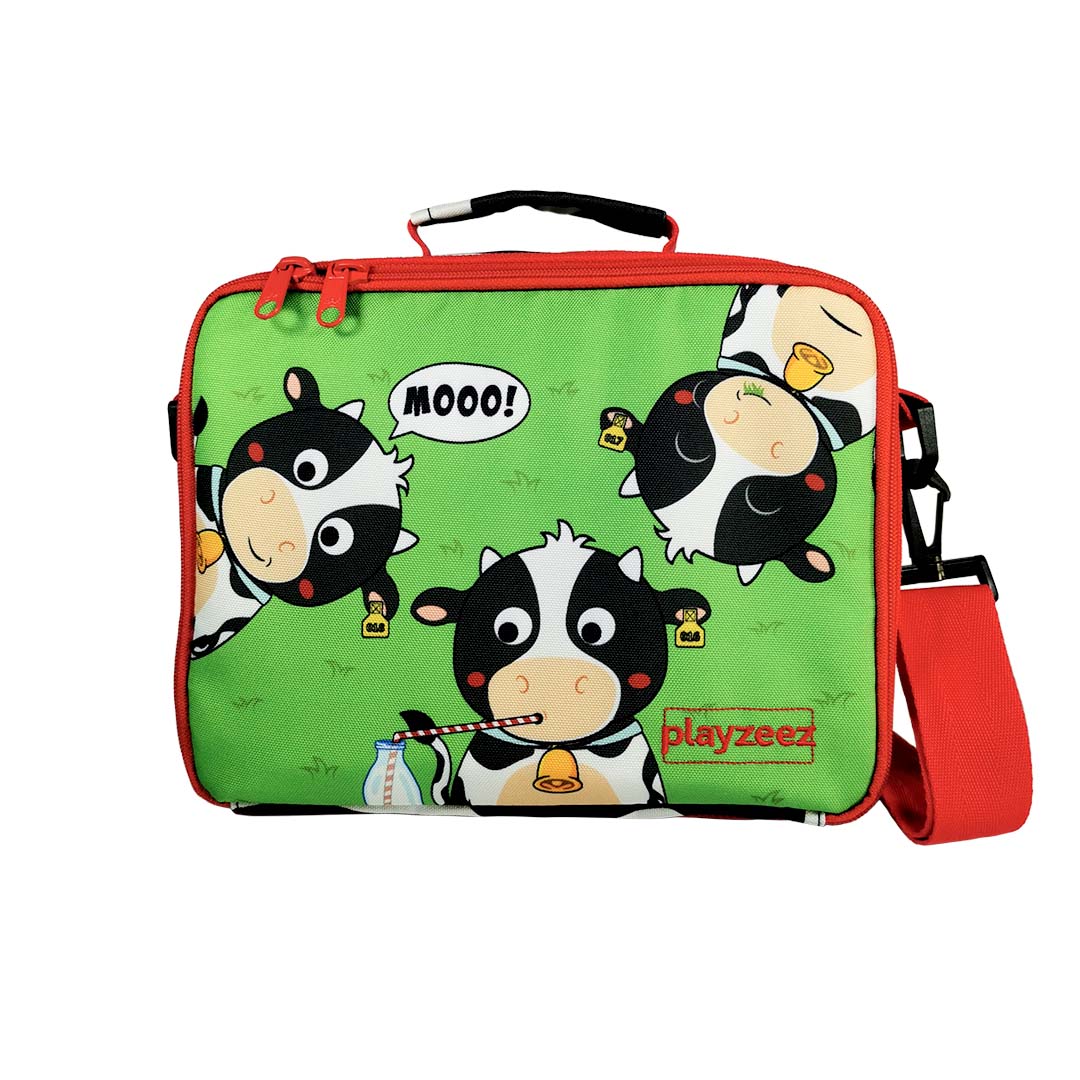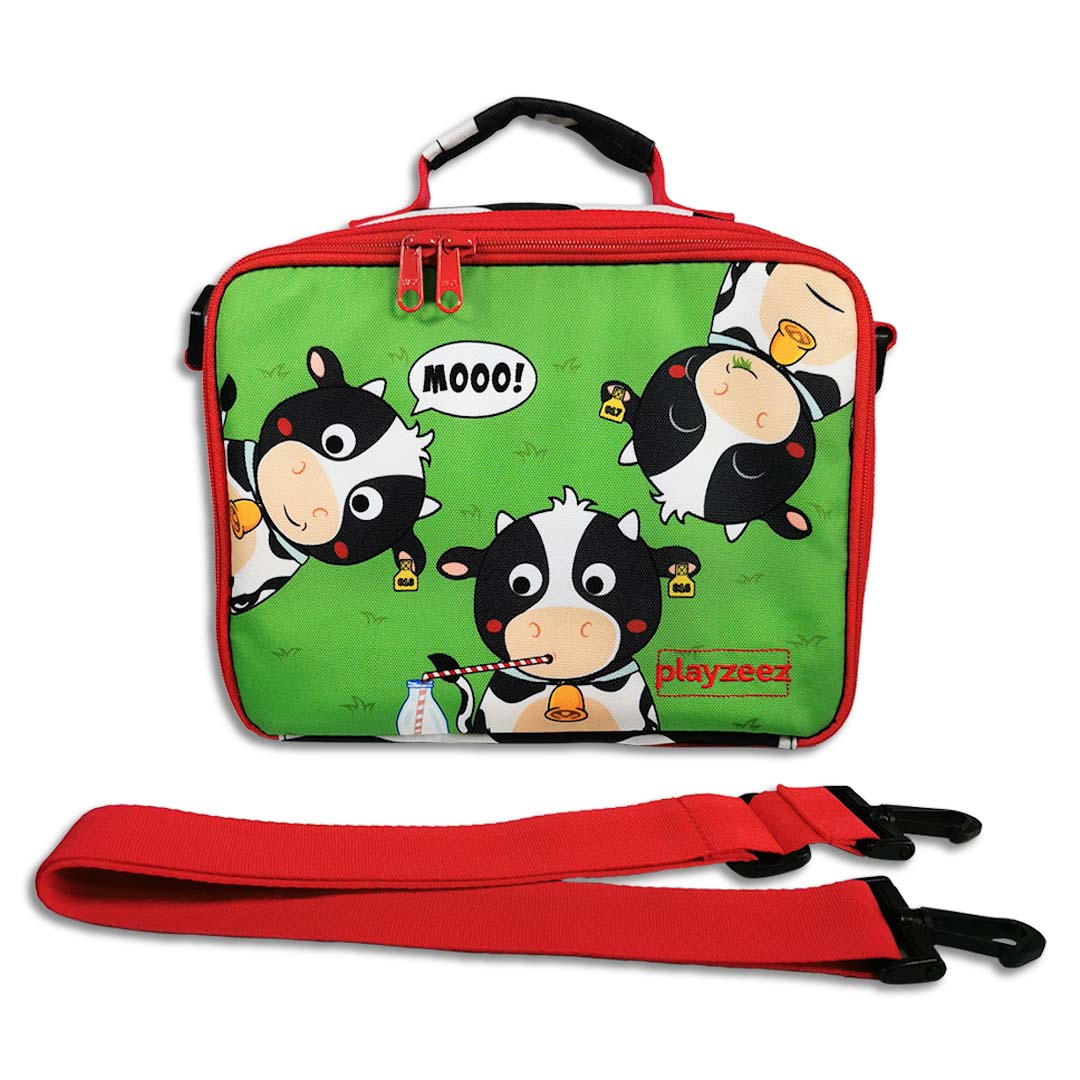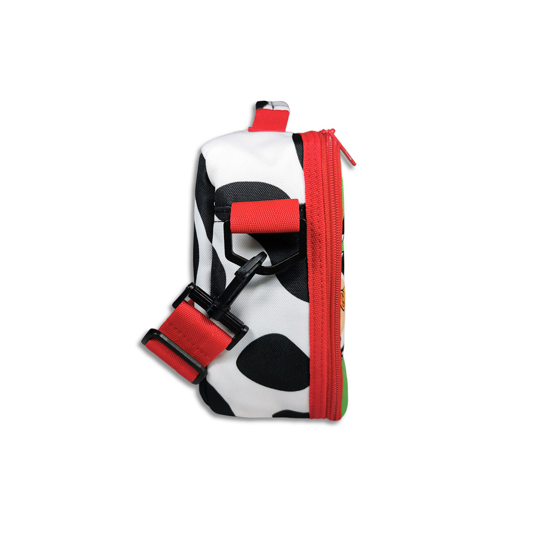 This kids lunch bag is perfect for every day use, whether it's used for school or travel. Made with durable materials and the PEVA lining is food grade safe and will keep snacks cool and fresh throughout the day. The sonic welding will prevent any leakage if anything bursts and it is easily cleaned with a machine wash. The added shoulder strap can be attached via the top clips of this cow lunch bag. It's a stress free way to carry it to school If your child's hands are full, making life easier when walking with their school bag.